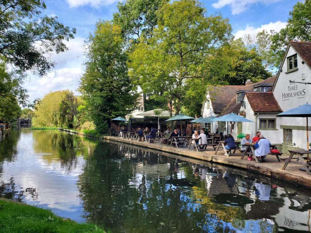 Along the brambly path, where the holly and blackberries grow, there is a place hidden away but not hard to find. Past rolling verdant hills and just beyond the overgrown bridge sits the most darling little pub. The building is old but cheerful, with a high peaked roof, green sash windows and adorned in a bright coat of white paint; it stands simple and strong. Like me the canal that runs along the patio seems spellbound, the water rolls by slowly- as if it too would like to stay here a little longer. Inky black letters on the front of the establishment proudly display the name, " The Three Horseshoes, Since 1535."