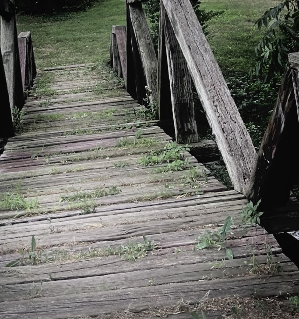 The old wooden slats bend underneath the pressure of their steps