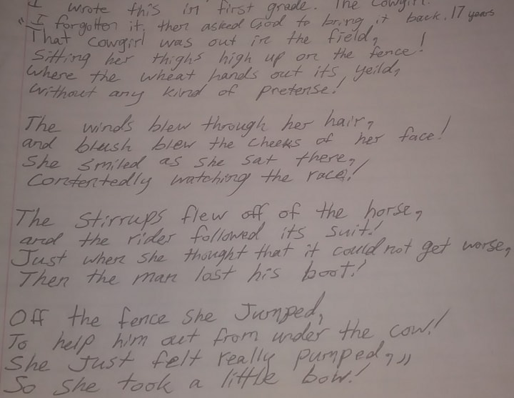 I wrote that poem in first grade and forgot it for 17 years, then asked my God to bring it back.