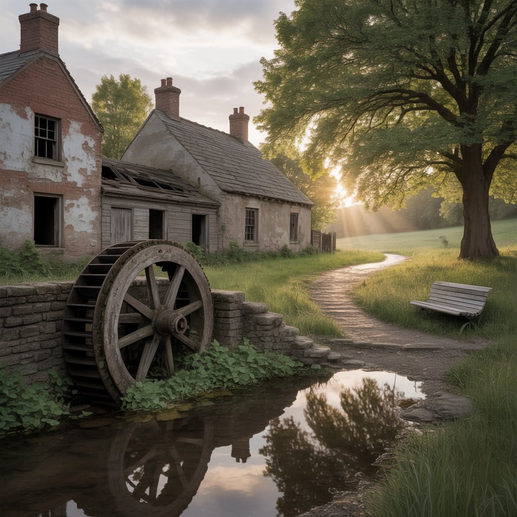 Imagery of Peace: He lists the simple, harmonious features that defined the community: protected cottages (shelter'd cot), working farms, a constant stream (never-failing brook), and a productive mill.