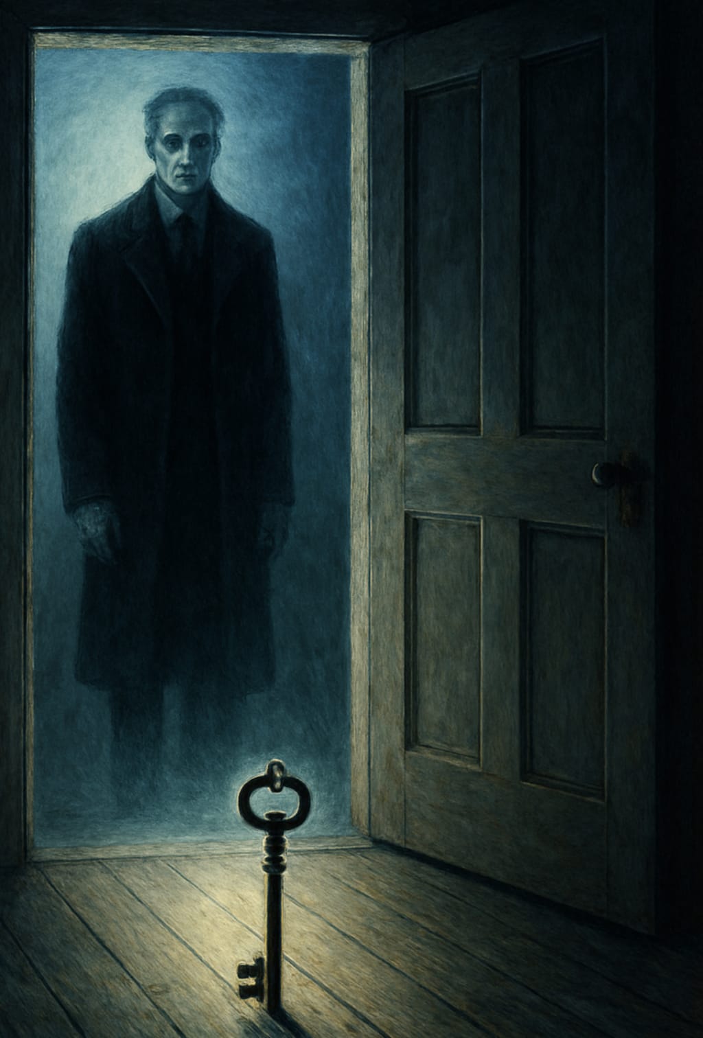 His coat dripping. His hands empty. His eyes not quite human.