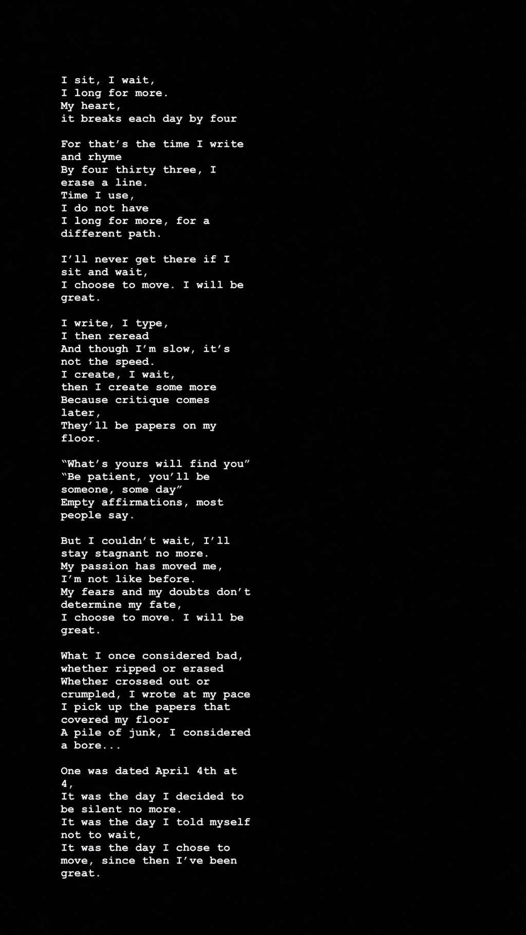 I signed up to enter into a poetry competition. I wanted to push myself to be a more poetic writer. I usually write for television & film. Excited to see what vocal’s all about!