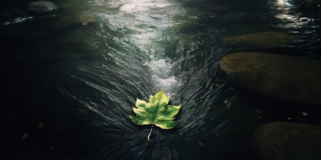A leaf, cascading down a river