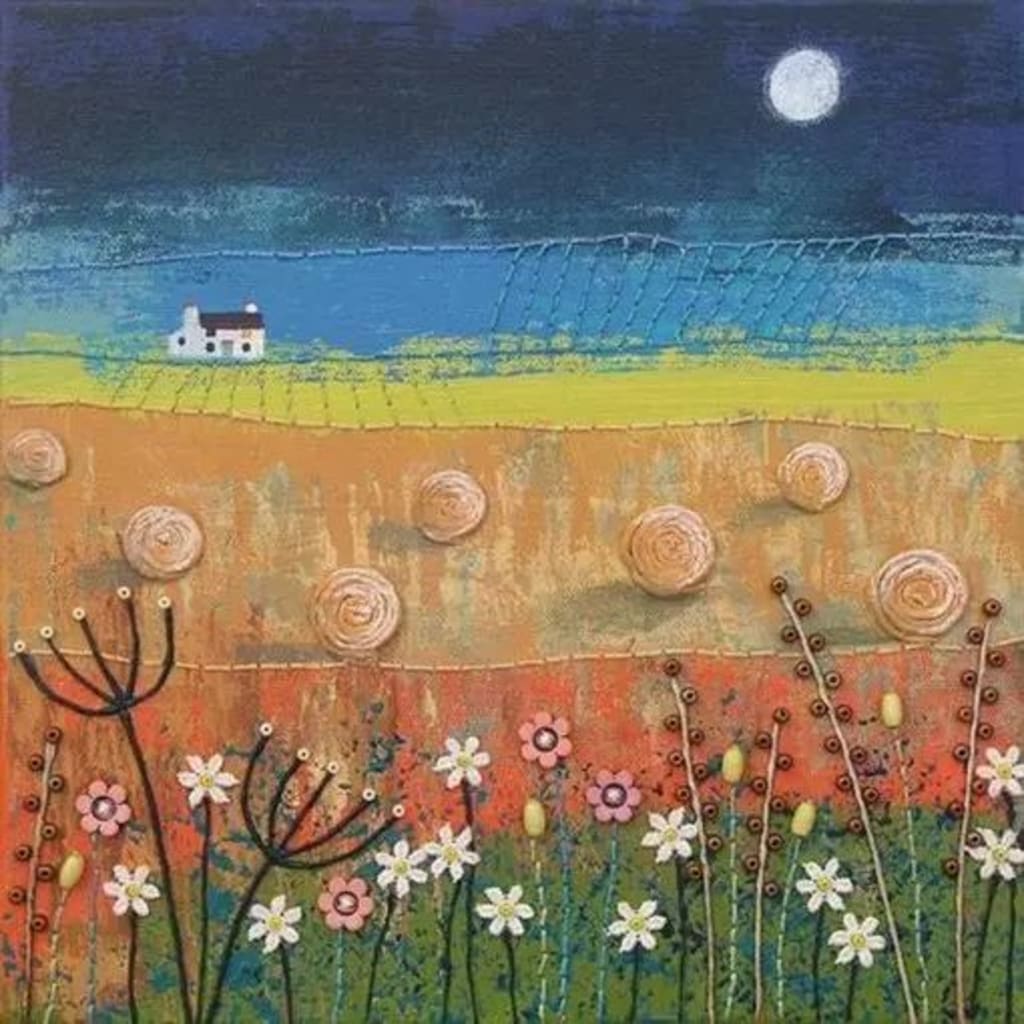 The brush in my hand swims between the green hills and the water