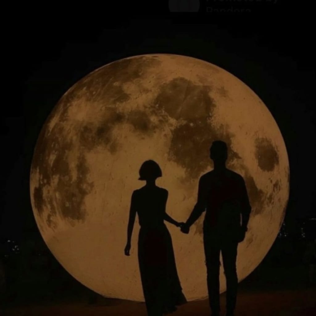 Dark shadows of a male and female couple, big yellow moon behind them - unknown source.
