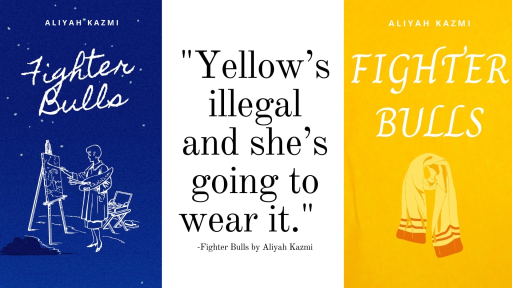 She walks towards the yellow scarf. She holds it up. The scarf billows in the wind, trying to fly to the outside world. She is almost tempted to let the scarf fly. Instead, she stands and wonders when young fighter bulls go from being trained to attack to willingly charging themselves.