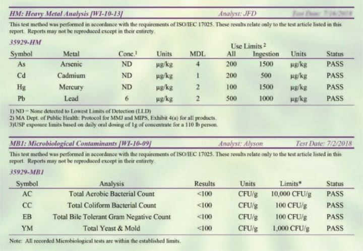 During the analysis process, a laboratory will determine if the sample contains any harmful contaminants such as heavy metals or microbial contaminants, such as mold or bacteria (this can usually be found at the end of the report).