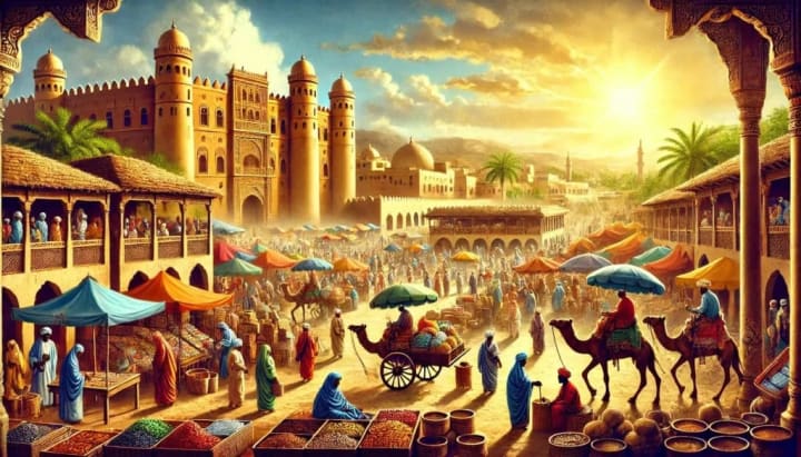 Zazzau as a central hub for commerce under Queen Amina's rule. The marketplace is bustling with activity, filled with traders, colourful stalls, and various goods. Traders with camels and carts are seen exchanging goods, symbolizing the wealth and prosperity brought to Zazzau. The background features the grand palace and iconic earthen walls of Zazzau, showcasing its significance. The sky is clear with the sun shining, casting a golden hue over the scene, symbolizing the economic boost and flourishing trade