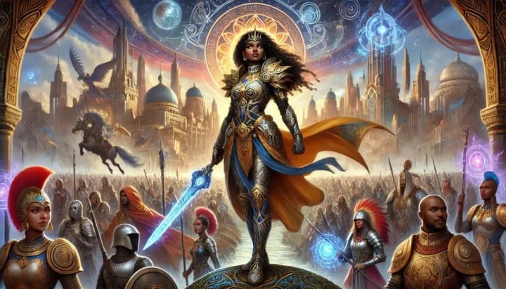 inspired by the graphic novel 'Malika: Warrior Queen' by Roye Okupe. The image features Malika, a character inspired by Queen Amina, embodying her warrior spirit and leadership qualities. Malika stands confidently in the center, clad in ornate, futuristic warrior armor with intricate designs. She holds a sword in one hand and a shield in the other, both glowing with mystical energy. Behind her, a diverse army of warriors stands ready for battle, their armor and weapons reflecting a blend of ancient and futuristic styles