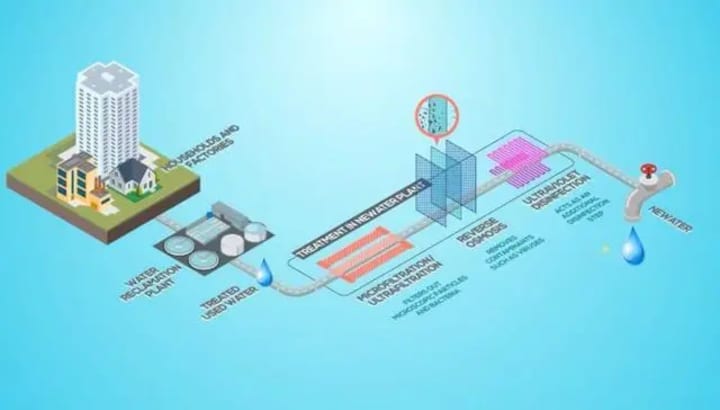 Ne Water is water that is cleaned and ready for human consumption in Singapore by recirculating sewage through ultraviolet disinfection and double membrane filtration.