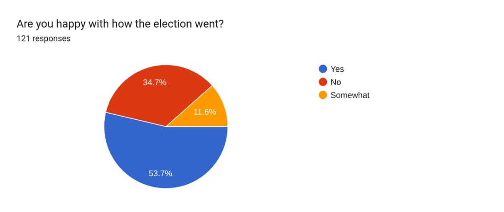 With the recent 2024 election, the students at MCHS filled out an anonymous, no-questions required survey of ten questions about how they feel going into these next four years with our new presidential elect, Donald J. Trump. Remember, having no questions required makes the total votes different for each question. To get a basis of where the students stood, they answered "Yes," "No," or "Somewhat" to the question "Are you happy with how the election went?". The results are as follows: 53.7% (65 votes) said "Yes," 34.7% (42 votes) said "No," and 11.6% (14 votes) said "Somewhat."