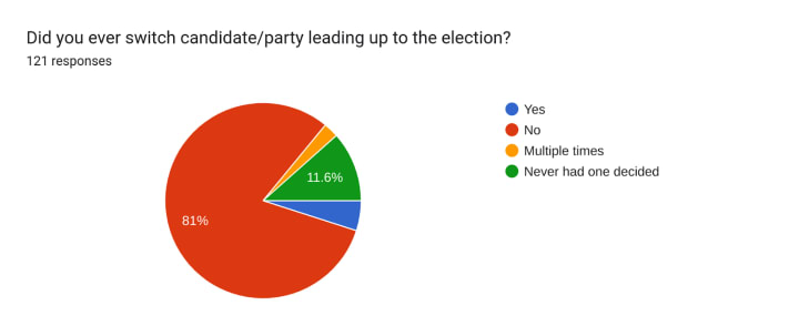 Now that we know where the students stand, we can ask the harder-hitting questions. The next question the students answered was, "Did you ever switch candidate/party leading up to the election?". Where it was a landslide of a question with 81% (98 votes) answering "No," 11.6% (14 votes) answering "Never had one decided," 5% (6 votes) answering "Yes," and 2.5% (3 votes) answering that they switched multiple times. These results show how made up the students' minds were heading into this election; most people had their candidate chosen from the start.