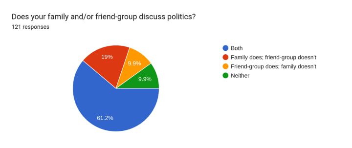 Halfway through the survey, at question number five, students were asked "Does your family and/or friend-group discuss politics?" Where there was a pleasing blowout of 61.2% (74 votes) saying both family and friends discuss politics, 19% (23 votes) said their family does, and 9.9% (12 votes) for friend-group, as well as 9.9% (12 votes) for neither. These results should be rather exciting or at least pleasant to see that, for the most part, students are talking about politics with their family and/or friends, which is always good because that keeps from being in an echo chamber of thoughts and opinions, and allows new information to be taken in.