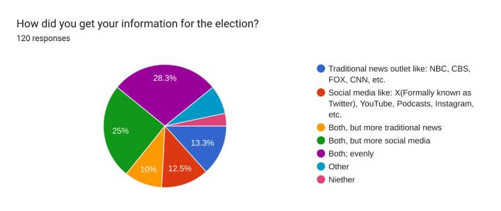 To see where the students got their political information, they answered the following question, "How did you get your information for the election?" The results are as follows, the top answer was 28.3% (33 votes) for "Traditional news outlets and social media," 25% (30 votes) answered "Both, but more social media," 13.3% (16 votes) saying they strictly use traditional news outlets like NBC, CBS, FOX, CNN, etc., 12.5% (15 votes) answered they strictly use social media platforms like X (Formally known as Twitter), YouTube, podcasts, Instagram, etc., 10% (12 votes) answered "Both, but more traditional news," and the other 14 votes were "other/neither". These results show that the students here at MCHS use both social media and traditional news but tend to use social media more. When combining the "Both, but more traditional news outlets" with the votes of strictly conventional news outlets, you get 23.3% (28 votes). Compared to adding "Both, but more social media" to students strictly using social media, you get 37.5% (45 votes), a blowout.