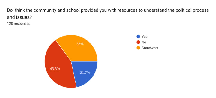 Question nine was, "Do you think the community and school provided you with resources to understand the political process and issues?" This question resulted in another landslide of 47.5% (47 votes) responding "No," 30.3% (30 votes) responding "Somewhat," and 22.2% (22 votes) replying "Yes.". The overwhelming results convey a clear message: the Madison community has some work to do with informing voters about the political process and issues. As the 47/120 student votes said, they weren't adequately prepared for election time.