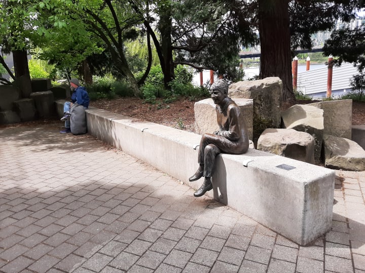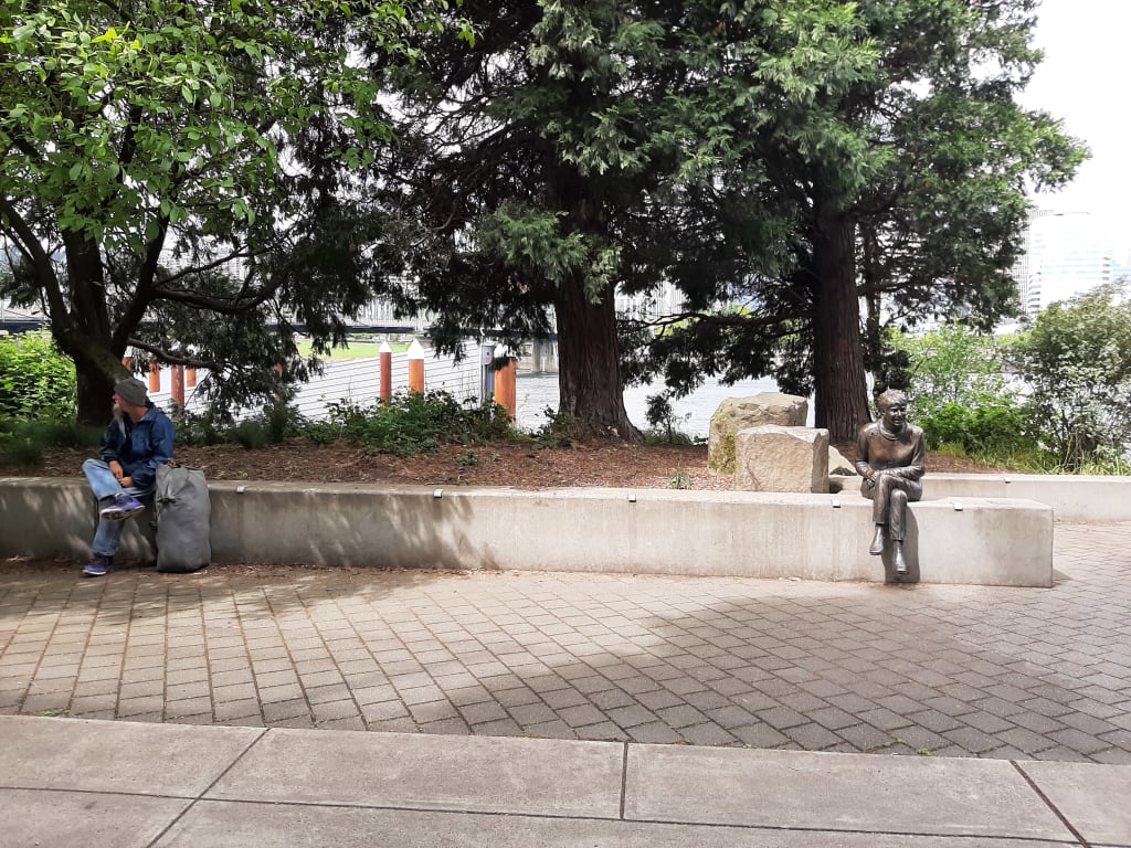 It appeared waiting for the bus, or walking took equal time. So I walked across the bridge over the Willamette river and following the directions took some stairs down. This is where my google maps got very confused. Apparently there are two stairs down from this bridge? I got very lost walking around the waterfront park and stumbled onto a homeless man and a statue in essentially the same pose. I asked the man for directions and permission to take his picture.