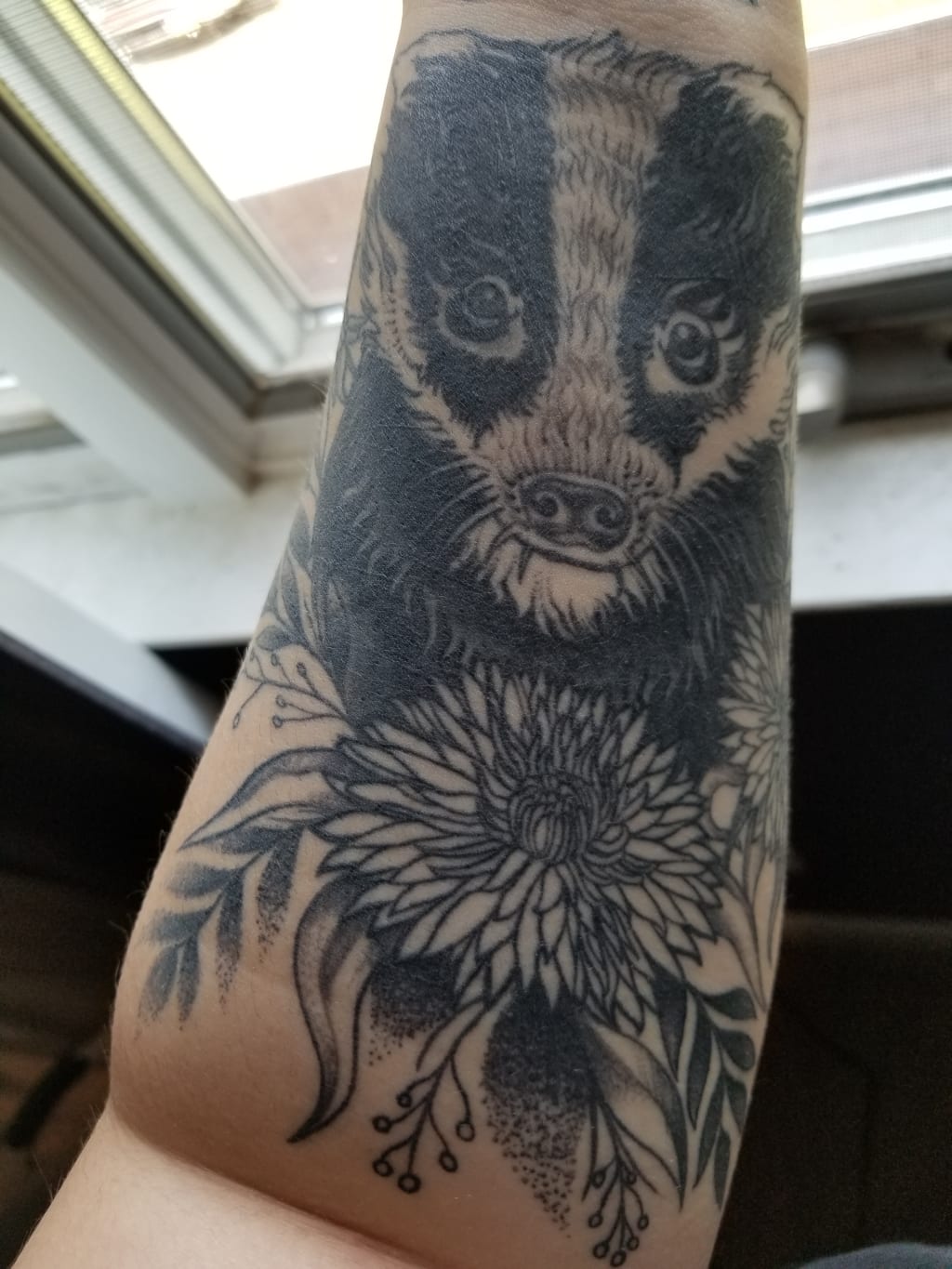 So, on my forearm is a beautiful picture of a badger. Funny story, it’s not a honey badger. I found the perfect artist, perfect picture of what I wanted, but it wasn’t of the perfect animal. On my forearm is a beautiful, regular English badger. And I absolutely love it. Life gives you what it gives you, and for me, it gave me this picture of a darling English badger and intricate dandelions that I painfully requested. I even had my tattoo put on upside down. It’s for me to look at. I want to look at my forearm and be proud of my story every day.