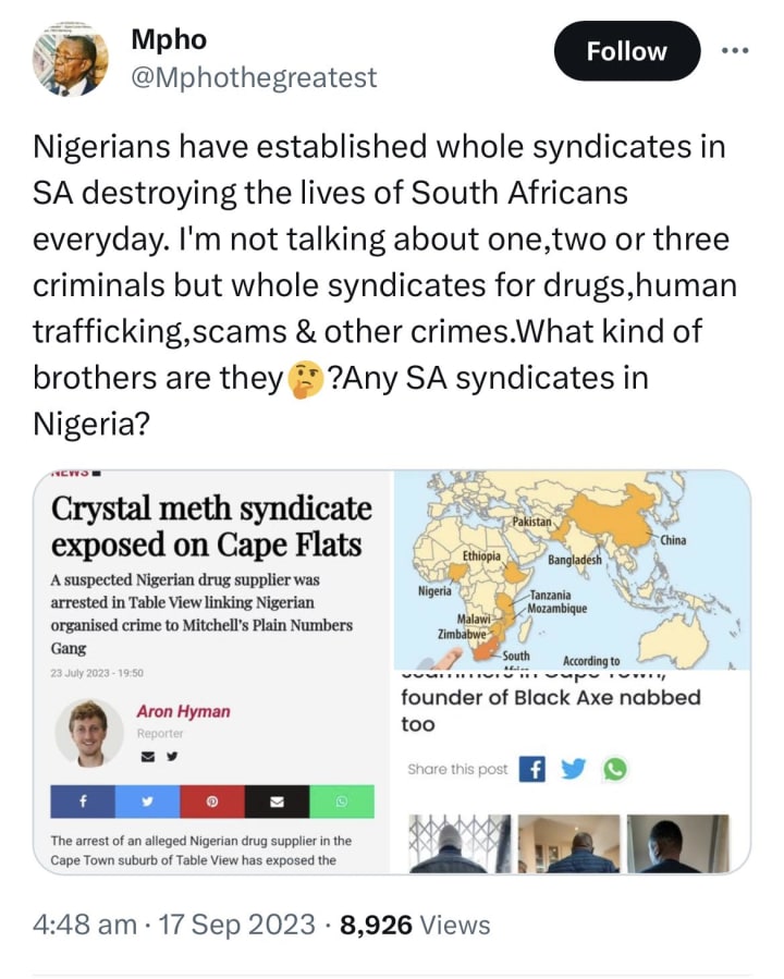 The vicious cycle goes on, South Africans blame Nigerians for the drug addiction in their family members, therefore raining down hatred for Nigerians. To be labeled as all drug addicts in Ghana where they're refused housing and employment.