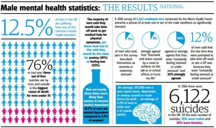 in 2014 there were 6122 suicides in the UK alone, 76% of those were males.