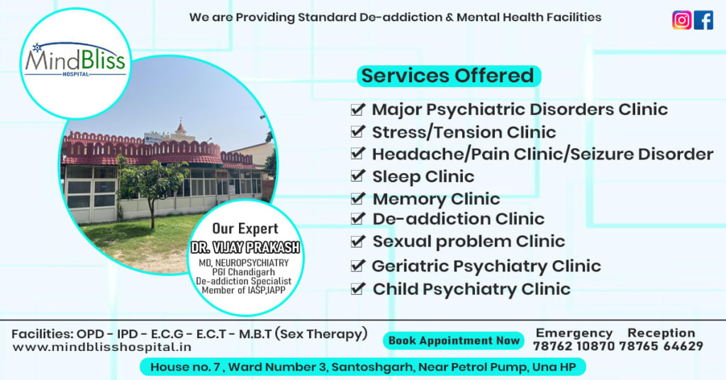 Mindbliss Hospital: Mindbliss Hospital, located in Una, Himachal Pradesh, is the best mental health and de-addiction center offering comprehensive care for individuals struggling with various psychiatric conditions. Whether it’s managing anxiety, depression, bipolar disorder, OCD, or substance abuse, the hospital’s expert team of psychiatrists and mental health professionals provides personalized treatment plans tailored to each patient’s needs.