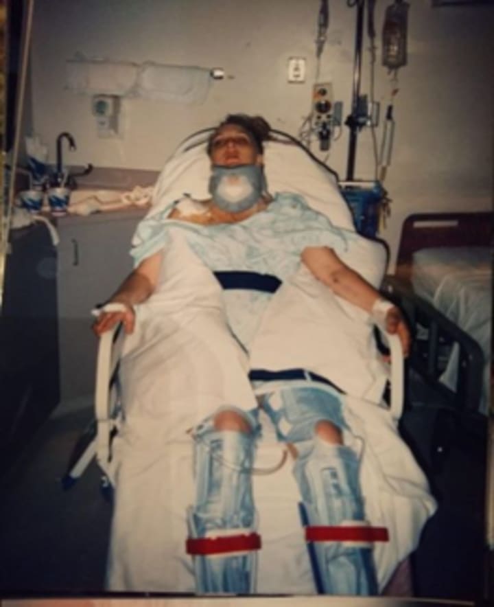 On the day of her accident, Toni and her boyfriend were meeting his cousin and his girlfriend. They went to a beach in Portland and played games, drink, had a good old time she calls it. There was barbeque, it was a nice, warm, sunny day. At the end of the day Toni remembers eating, playing, but she does not remember the rest. Her boyfriend later told Toni that she said that they could not go home, and they need to go to his cousin's house which was right down the street. He decided that he did not want to go there, he wanted to go home. Toni passed out in the passenger seat. He drove through Cornelius Pass on their way home. Toni does not know what made him go off the road. They ended up going off the road at Cornelius Pass, rolling down to the bottom with a railroad tie sticking out. During the rollover, the top of the car ended up on the railroad tie and it come through the roof, hit Toni's seat and her neck, pinned her against her legs, shattered C6 and C7 of her neck. Piecing together the timeline she thinks that her boyfriend was knocked out for about 20 minutes. The only thing Toni remembers is waking up against her legs and feeling something warm. It was her blood. She was folded in half. Imagine sitting in a chair and pinned against your legs. The next thing she remembers is arguing with the ED doctor about Traci's phone number. The next thing she remembers is being in ICU. She was in a halo because she had a broken neck.