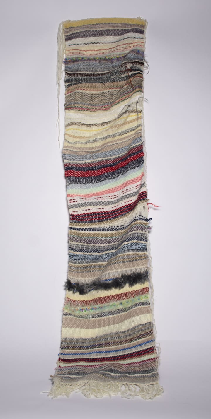 So I started stumbling through my weaving studies, realizing that I didn't like to follow tutorials, I was just bent on figuring out how to get the wool to form different textures and patterns on the loom in my own way. As a result I made some odd things that I guess were a little bit removed from what the general sense by good textiles. But I had fun with it. I realized that it dealt well with my self-loathing. I allowed these strange pieces to exist, just as I allowed my clumsy self, who was always making mistakes, to exist.