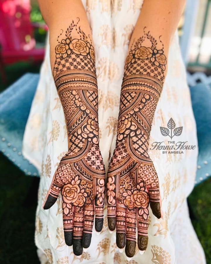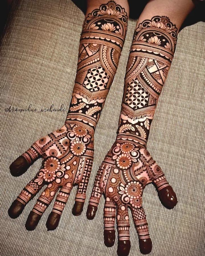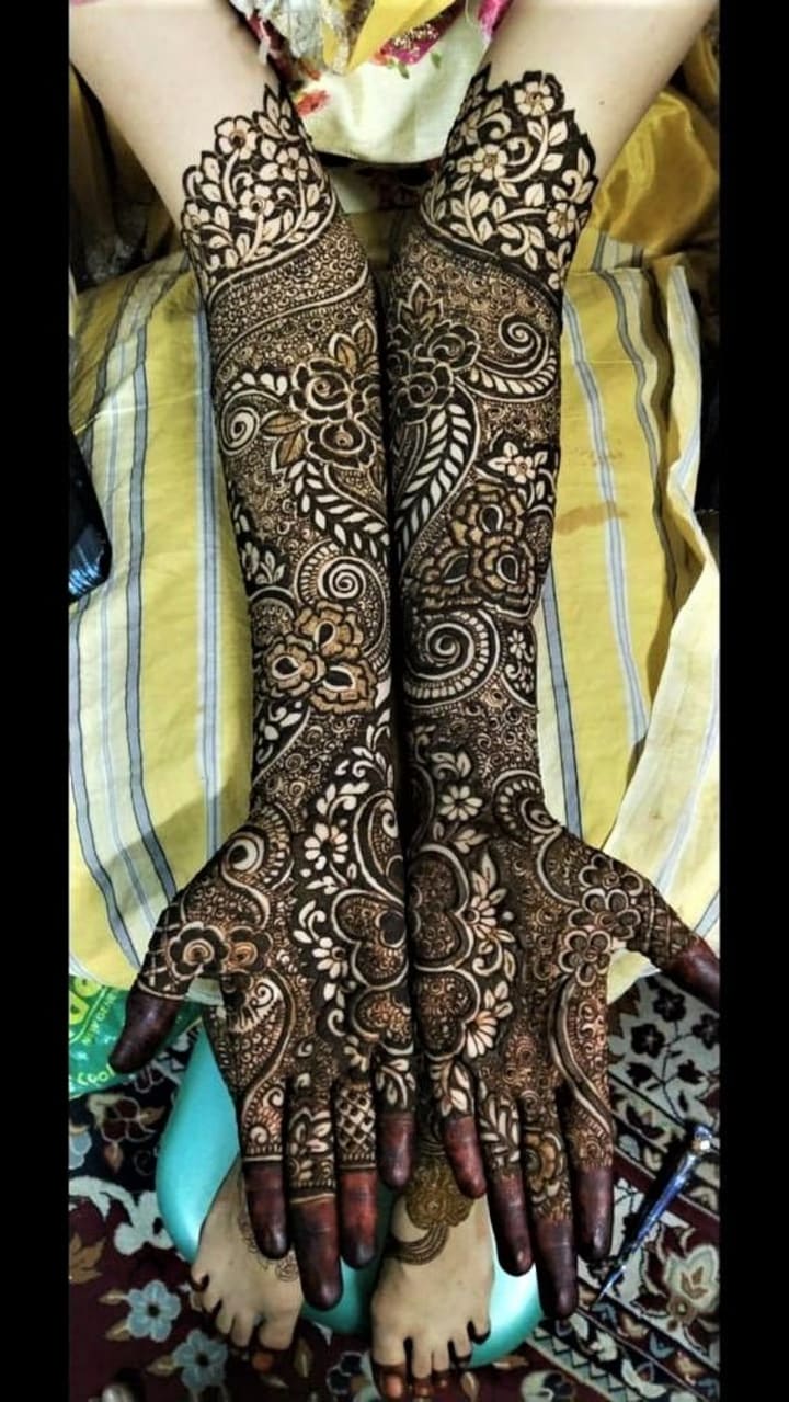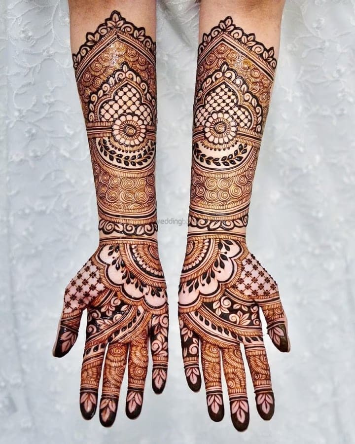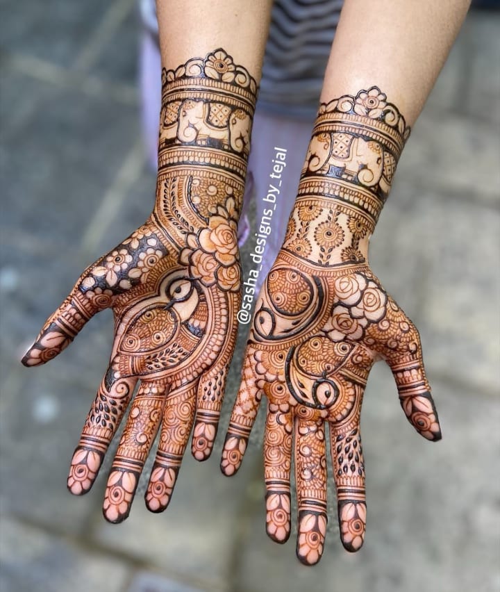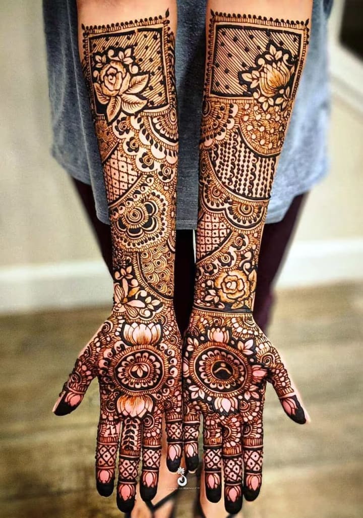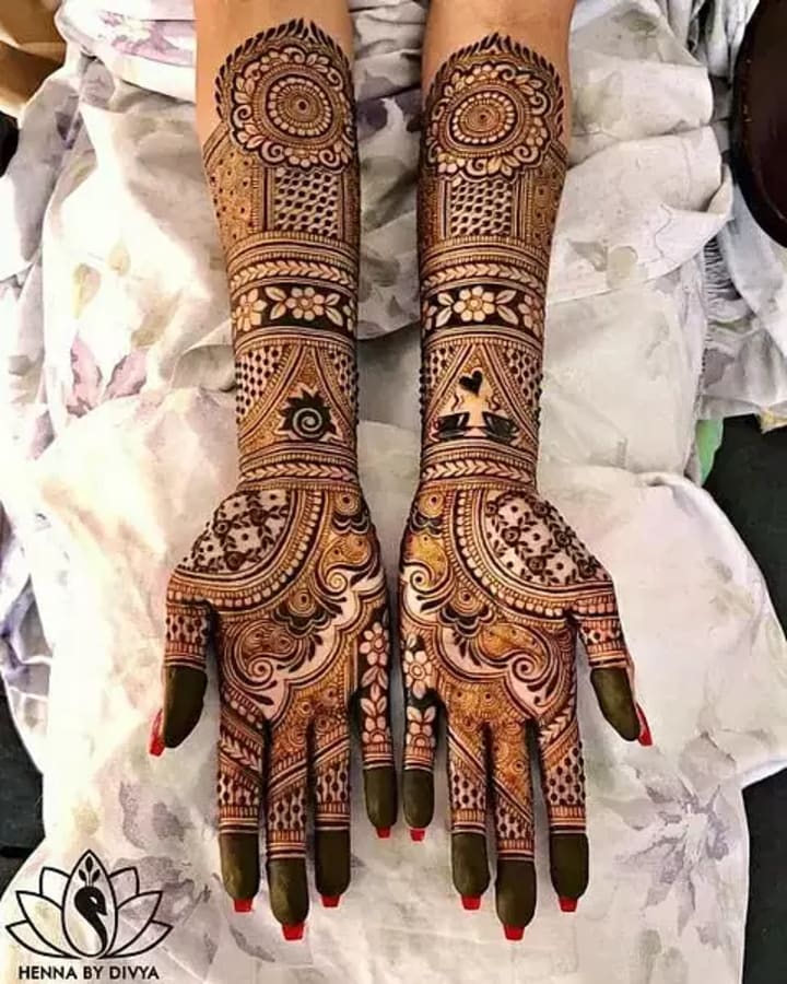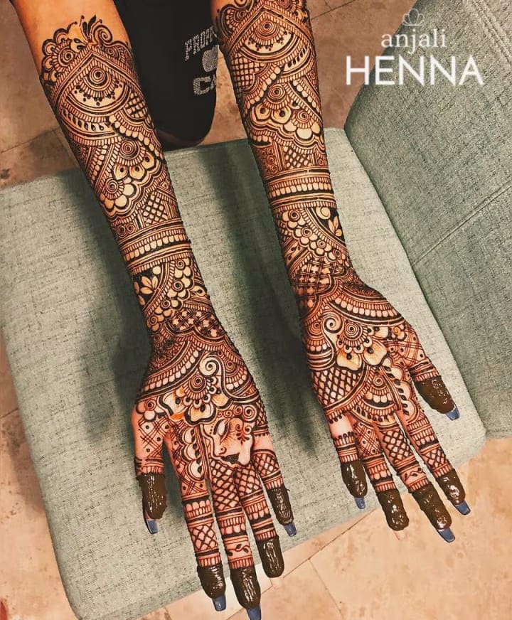 For many brides, traditional mehndi designs remain timeless. These intricate patterns often cover the entire hand, from the fingertips to the wrists, and extend all the way to the elbows. They typically include elements like paisleys, flowers, and delicate mandalas.