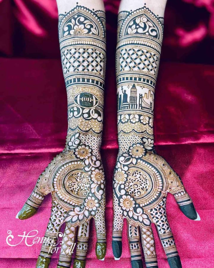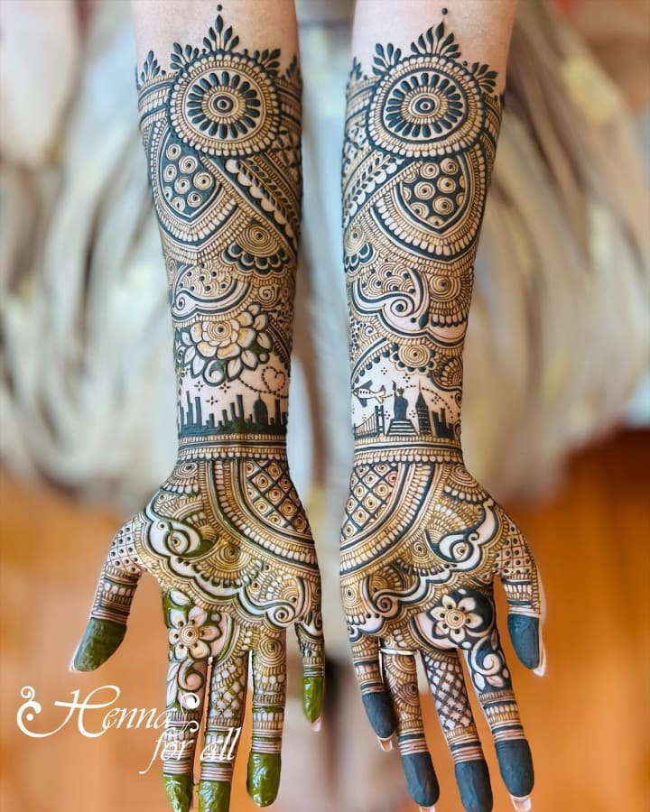 One of the latest trends in dulhan mehndi is personalization. Brides now love to include special elements that hold personal meaning, like symbols of their hobbies, a tribute to a loved one, or even landmarks from their love story.