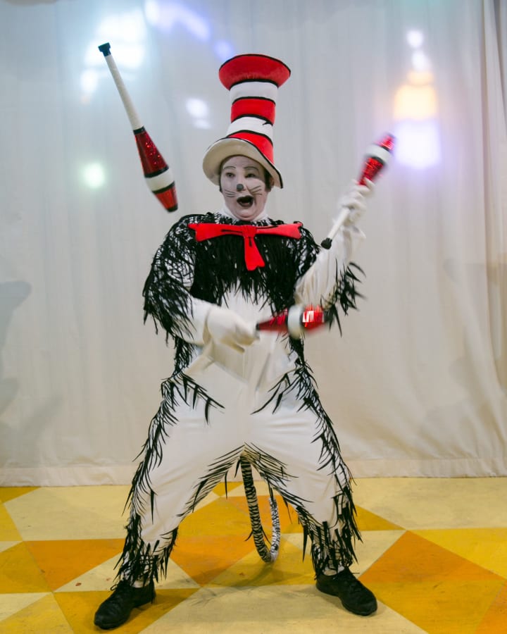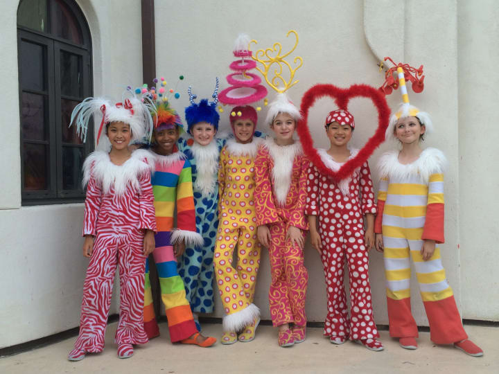 These were the ‘Nools’ for Seussical. I created all of the costumes out of fleece and made all of the headpieces. The two costumes with horizontal stripes were also hand cut and pieced striping. Oftentimes, a commercially purchased striped fabric just does not have enough impact on stage because the scale is too small and I have to create the stripes (or polka dots, or whatever) myself. Notice that I also created shoes to match each costume.