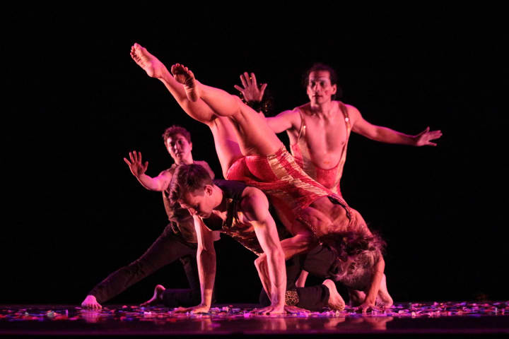 These striped costumes for Joe Goode Performance Group were created by cutting and sewing stripes of gold and red stretch velour in a pattern that accentuated the curves of the dancers bodies. All garments were made by me except for the black trousers.