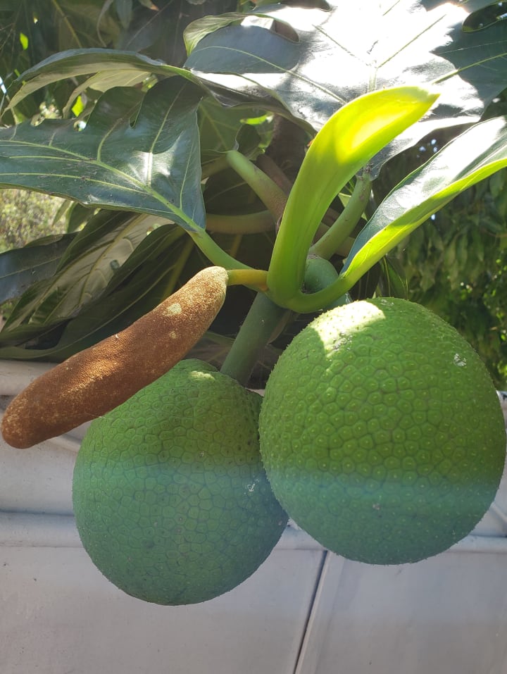 Do you think I am weird for creating this beautiful work of art? The name of this fruit is Breadfruit. It is eaten roast or boiled across Jamaica and other Caribbean islands.