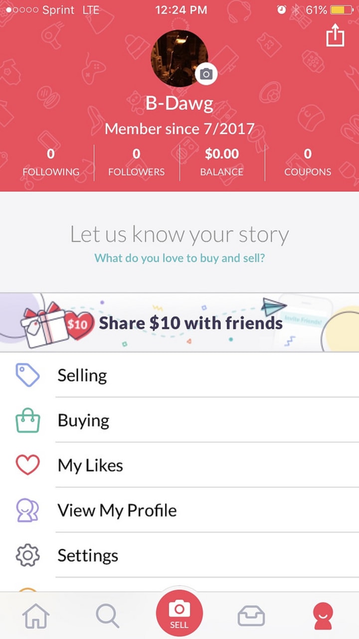 The photo below shows you basically your account. Most people will only purchase from verified accounts unlike the one below. You can follow other accounts, gain followers, make money, and even get coupons! You can verify your account easily. You have many options on how to verify it. Either through Facebook, email, and phone number.