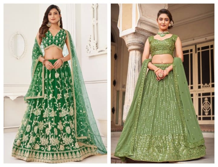 The fabric type of your green lehenga set has a huge impact on your look and your comfort level. Traditional fabrics like silk, velvet, and brocade have a luxurious, rich appeal appropriate for formal wedding ceremonies. Fabrics like georgette, net, and chiffon are lightweight and flowy and these are perfect for sangeet or mehendi functions, where you may wish to feel a little more unrestrained! And think about the embellishment - zari, sequins, or gota patti embroidery adds to an Indian lehenga and gives it a royal touch.