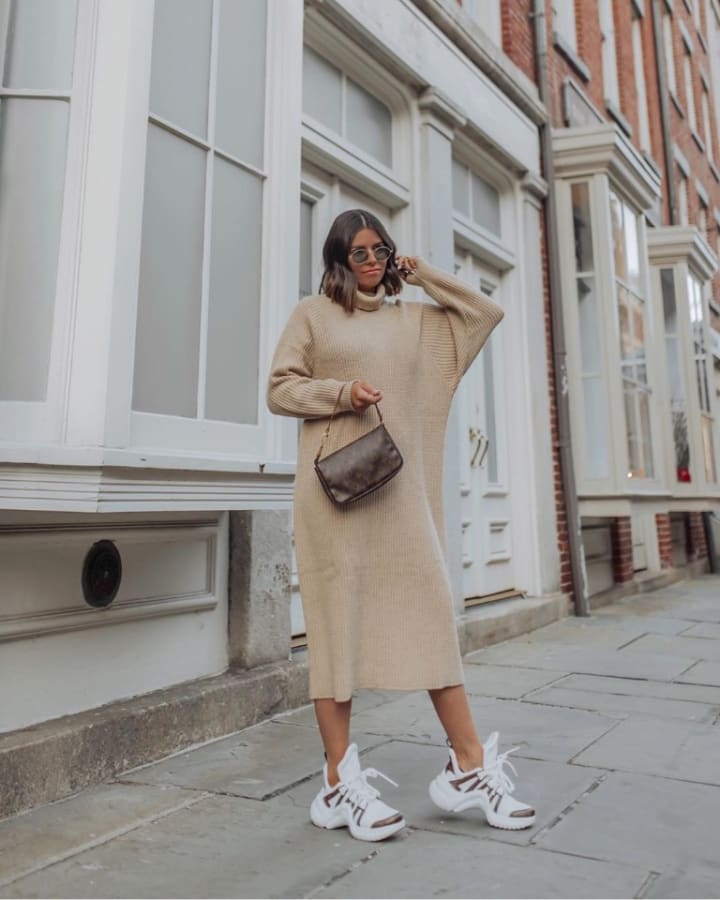 Lovers of sports chic can be recommended a combination of voluminous dresses in restrained colors with large sneakers.