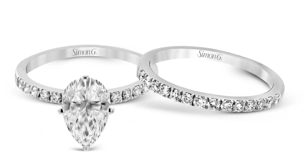 A solitaire setting features a single pear diamond on a plain band. There are no other stones to distract the eye. This style is perfect for the person who loves clean lines. The pear shape is very distinct. It does not need extra decorations to look classy. A thin band in yellow gold or platinum allows the "teardrop" to be the star. It will look just as good fifty years from now as it does today.