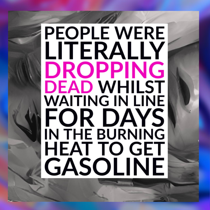 People were waiting for days in the heat and reports began coming in of people dying in those queues. Videos also circulated widely within the country of police brutality at gas station queues. Those who had been waiting and suffering in the baking heat were pushed aside for wealthy SUVs to appear without queuing and fill up their massive tanks with fuel. The people voiced outrage and questioned why this was being allowed. This was met with batons, arrests and I even saw a video of a gun being drawn on an unarmed and non violent man.