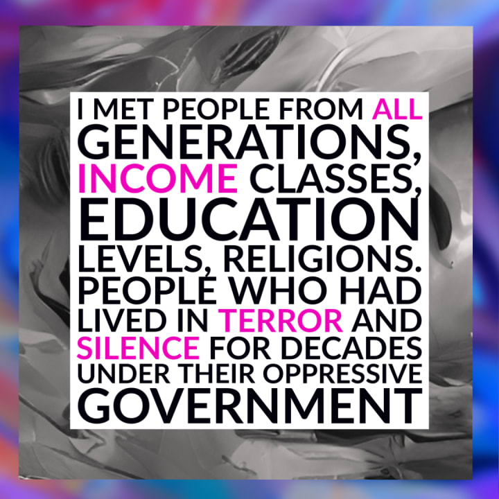 Over the months I was there, I spoke to hundreds of individuals. I listened to poetry readings. I watched musicians and artists come together. I watched as people of different religions and social classes united together with a common enemy. A government who they told me were corrupt on an inconceivable scale.