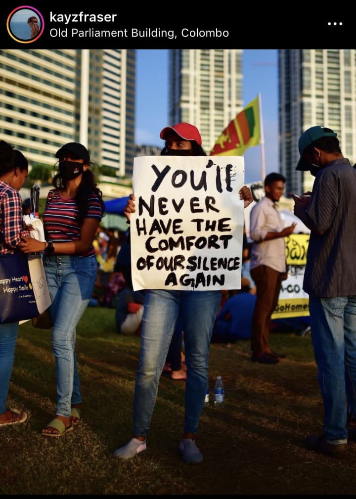 This quote is in reference to the older generation in attendance at the Colombo protests. I will never forget the fear I saw in the eyes of old men as they shared their stories about brothers, fathers, uncles and friends who were accused of speaking out against this government and never seen or heard of again.