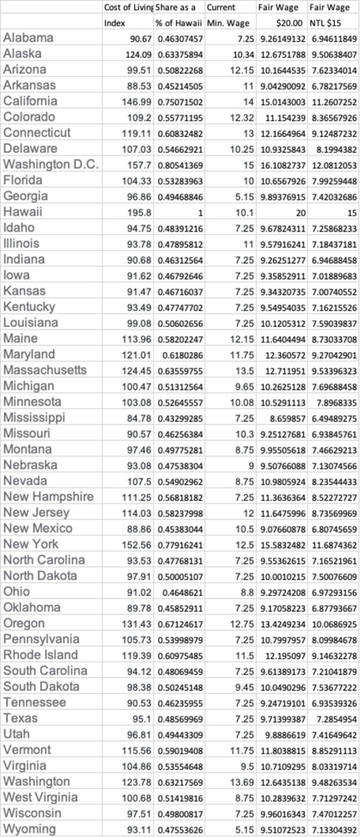 And while others have said that the reason for raising the minimum wage is to pay all workers a reasonable living wage --- that goal could easily be achieved using the methodology under discussion. This can be accomplished by having policymakers select a fair and optimal living national minimum wage and then adjusting that wage to each State’s cost of living index to ensure we treat all workers in a similar manner, irrespective of where they reside within the United States.