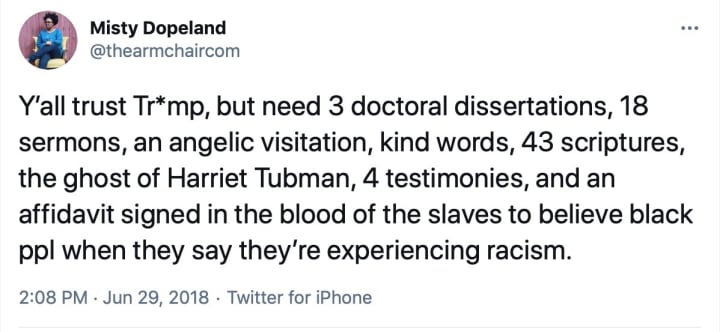 Also, in the summer of 2018, Ally was generous in sharing her knowledge and experience with me through a series of live videos where we discussed many of the difficult issues involving race in our nation. I learned a great deal about myself through these interactions with Ally, specifically I received the revelation that when it comes to these issues I should not expect to have much to say, at least not in ways that are on par with the lived experiences of Black people.