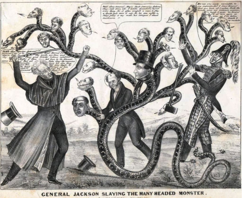 Jackson was hardly an egalitarian. The press at the time called him King Andrew because he ruled by what we would now call executive order. And he ruled with an iron fist. I say ruled, rather than governed. The United States had, at one time, a national bank, much like the Bank of England. The Jacksonian Democrats thought the bank was a tool of corporate interests. So, Jackson destroyed it. He refused to recertify the bank’s charter and the bank collapsed.