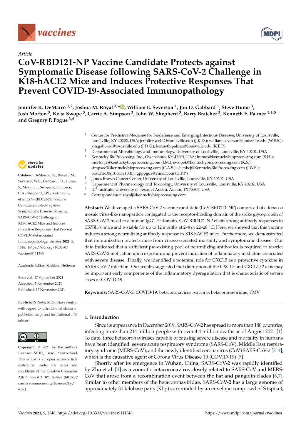 Two landmark papers by researchers from the University of Louisville's Center for Predictive Medicine for Biodefense and Emerging Infectious Diseases, and Kentucky Bioprocessing an Owensboro, KY biotech company almost nobody has ever heard of, were published very recently in a special issue of the Journal Vaccines. Link to journal homepage here. Link to special issue with the two papers is here. (Vaccines is an open access journal and the full text of the two articles can be found here and here) Researcher Mrs. Jennifer DeMarco is lead author on the second paper which demonstrates conclusively the efficacy of a new vaccine (not mRNA based) in mouse models. This vaccine is based on a relatively new technology and possible new vaccine platform. This new platform uses tobacco mosaic virus as the vehicle for antigen delivery, and the tobacco plant itself as a natural manufacturing system to provide a means for producing a stable, effective, vaccine against SARS-CoV-2, and likely its many variants as well.
