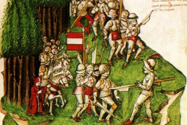 At the time, all of the Swiss cantons were under the control of the Habsburgs in Austria, though the Swiss were getting pretty tired of that arrangement. They decided to declare independence and formed a Swiss confederation of their own. That was, understandably, fiercely opposed by the Habsburgs, who sent in an army of 15,000 of the best Imperial knights they had to crush the rebellion.