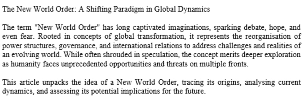 The term "New World Order" has long captivated imaginations, sparking debate, hope, and even fear. Rooted in concepts of global transformation, it represents the reorganisation of power structures, governance, and international relations to address challenges and realities of an evolving world. While often shrouded in speculation, the concept merits deeper exploration as humanity faces unprecedented opportunities and threats on multiple fronts.