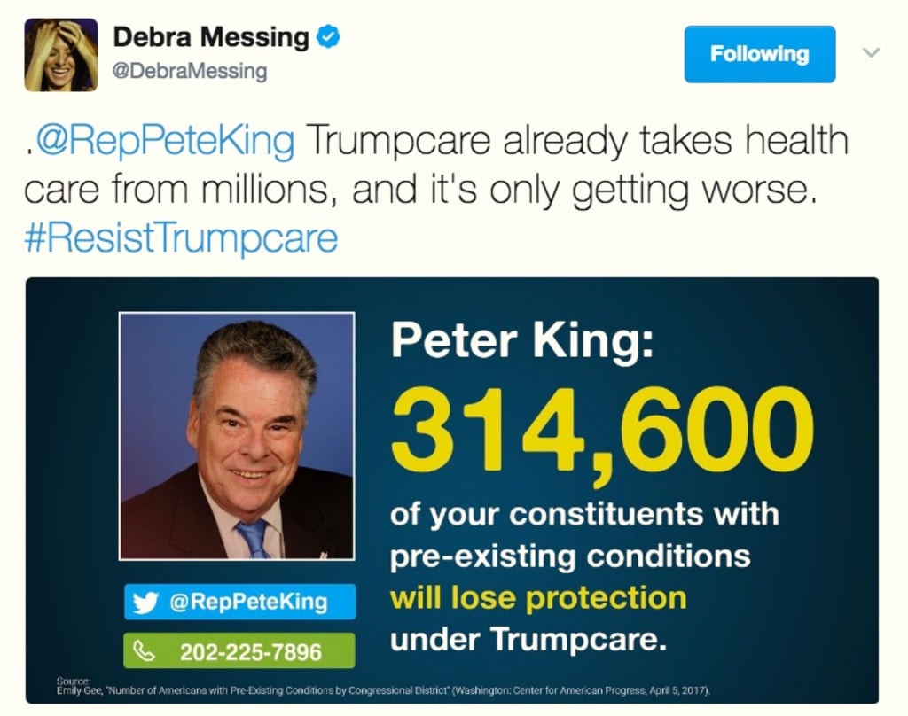 Activists like actress Debra Messing and House of Cards creator-producer Beau Willimon camped out in the Twitterverse and stayed there to the end, railing against the bill and encouraging twittizens to do the same. “Trumpcare already takes health care from millions, and it’s only getting worse,” Messing tweeted repeatedly on Wednesday, using the same message in tweets to several Republican lawmakers.