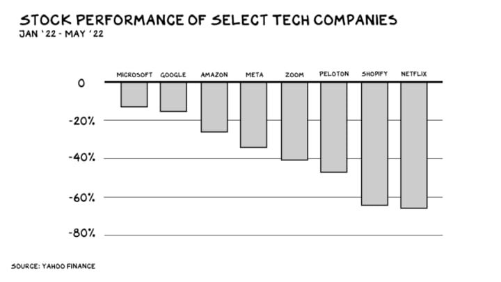 The Rube Goldberg device of economic turmoil (which began with an enemy one-400th the width of a human hair) has, despite our distractions, captured the attention of the market. Roughly half the stocks in the Nasdaq are down 50% from their 52-week highs, a quarter are down 75%, and more than 5% are down 90%. The only comparable drawdowns in Nasdaq history came in 2000 and 2008. The pandemic’s darlings, i.e. high-growth tech companies with online-rooted businesses, are enduring the greatest declines.