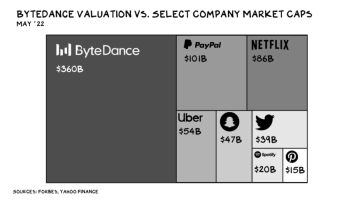 It’s still the Attention Economy, however. And the business iceberg whose mass is hidden underwater by the lack of a daily mark, as it’s private, is not a bird app or Netflix. It’s … TikTok. TikTok’s parent company, ByteDance, is now the most valuable startup in the world — with an estimated valuation of $360 billion, larger than Netflix, Twitter, Snap, Uber, and PayPal combined. Ironically, this was the value of Netflix just six months ago.