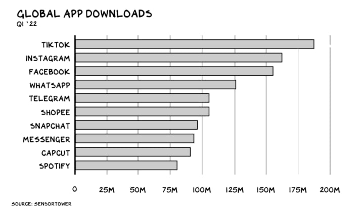 In the first quarter of this year, TikTok surpassed 3.5 billion all-time downloads, becoming the fifth app (and the only one not owned by Meta) to cross this threshold. It was also the most downloaded app this quarter, and for the last five.