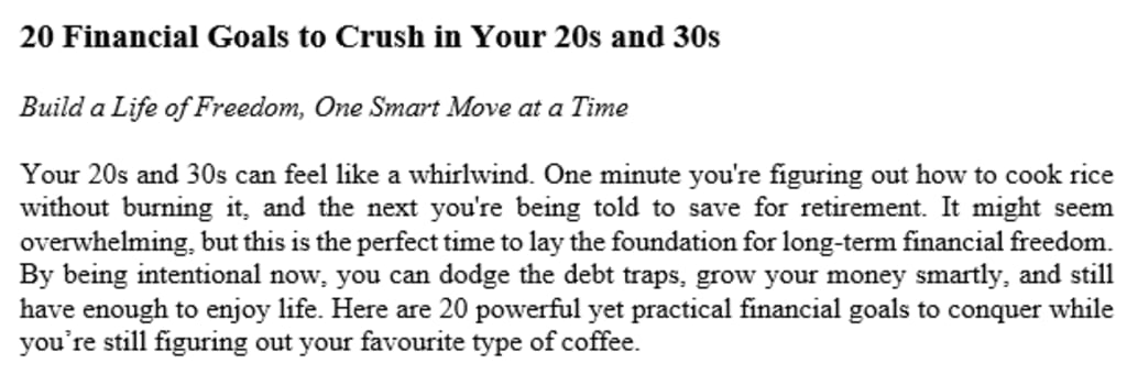 Your 20s and 30s can feel like a whirlwind. One minute you're figuring out how to cook rice without burning it, and the next you're being told to save for retirement. It might seem overwhelming, but this is the perfect time to lay the foundation for long-term financial freedom. By being intentional now, you can dodge the debt traps, grow your money smartly, and still have enough to enjoy life. Here are 20 powerful yet practical financial goals to conquer while you’re still figuring out your favourite type of coffee.