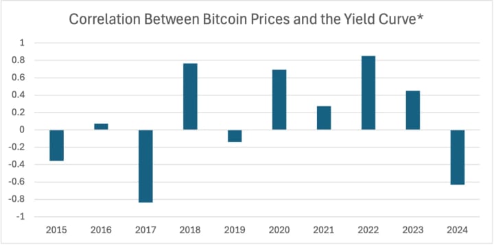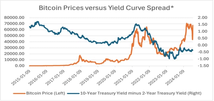 A study by Choi and Shin finds that bitcoin has an unreliable relationship with inflation expectations and economic fundamentals. Our analysis revealed that bitcoin exhibited a logical positive relationship with rising inflation expectations, while at other times, it sported a negative relationship! We confirm this phenomenon by computing the correlation between bitcoin prices and the yield curve defined by the spread of the 10-year Treasury yield minus the 2-year Treasury yield.